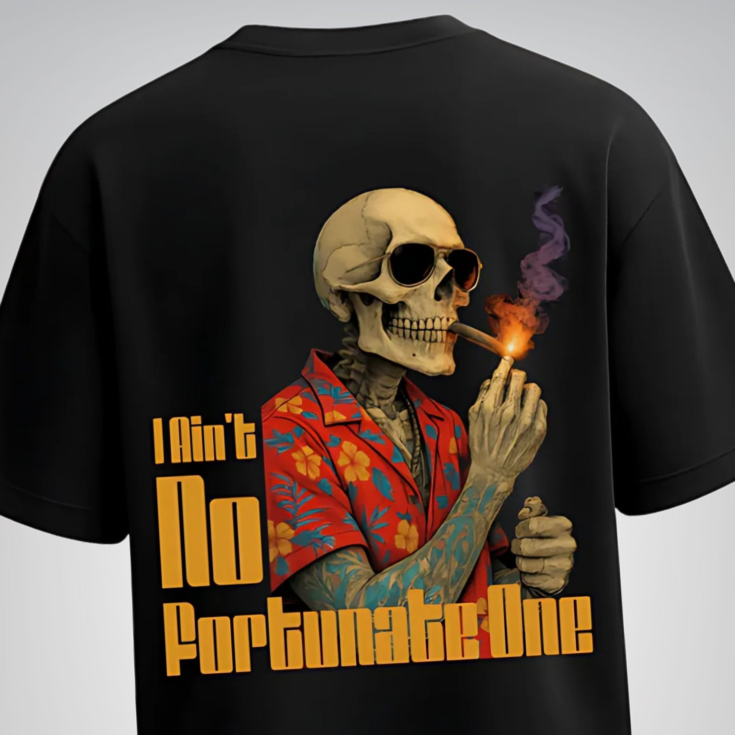 Dripped in dark humor and laid-back chaos. Featuring a slick skeleton rocking shades, tattoos, and a fiery cigar in a bold Hawaiian shirt, this design screams chill, but don’t mess with me.